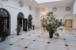 Foyer w Domu Studenckim Hanka to przestronna i reprezentacyjna przestrzeń o powierzchni około 160 m², przeznaczona do wynajmu na różnorodne wydarzenia. Stanowi część holu zlokalizowaną pod efektownym świetlikiem w kształcie piramidy, co nadaje wnętrzu wyjątkowy charakter i zapewnia naturalne doświetlenie przestrzeni.