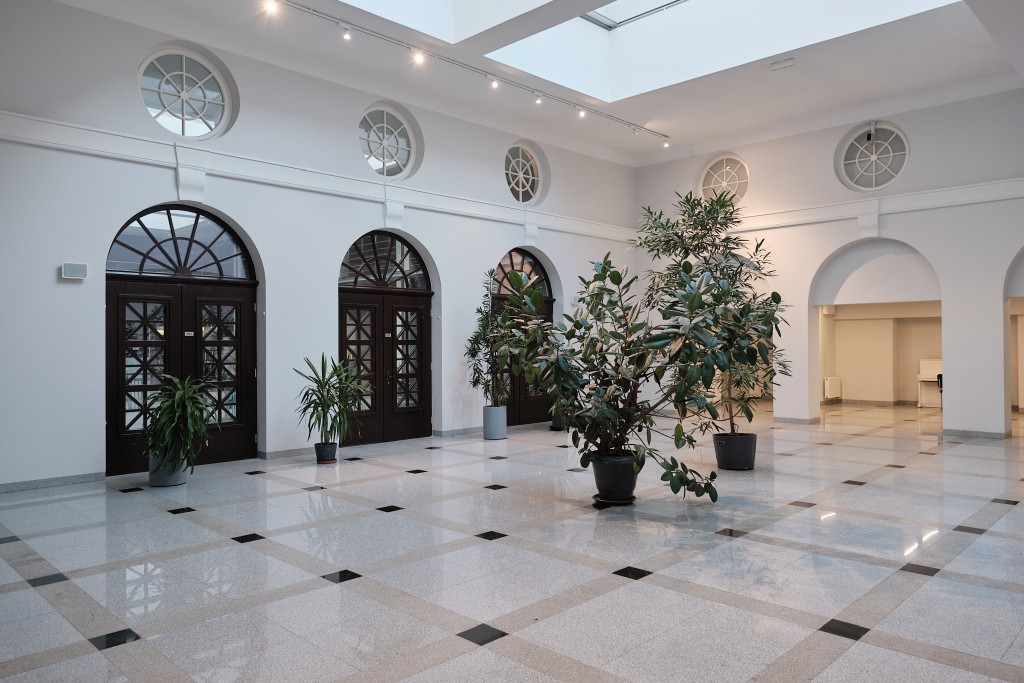 Foyer w Domu Studenckim Hanka to przestronna i reprezentacyjna przestrzeń o powierzchni około 160 m², przeznaczona do wynajmu na różnorodne wydarzenia. Stanowi część holu zlokalizowaną pod efektownym świetlikiem w kształcie piramidy, co nadaje wnętrzu wyjątkowy charakter i zapewnia naturalne doświetlenie przestrzeni.